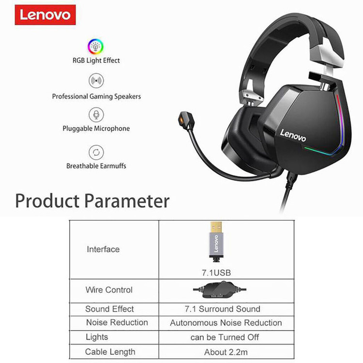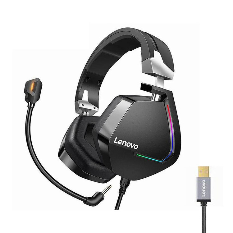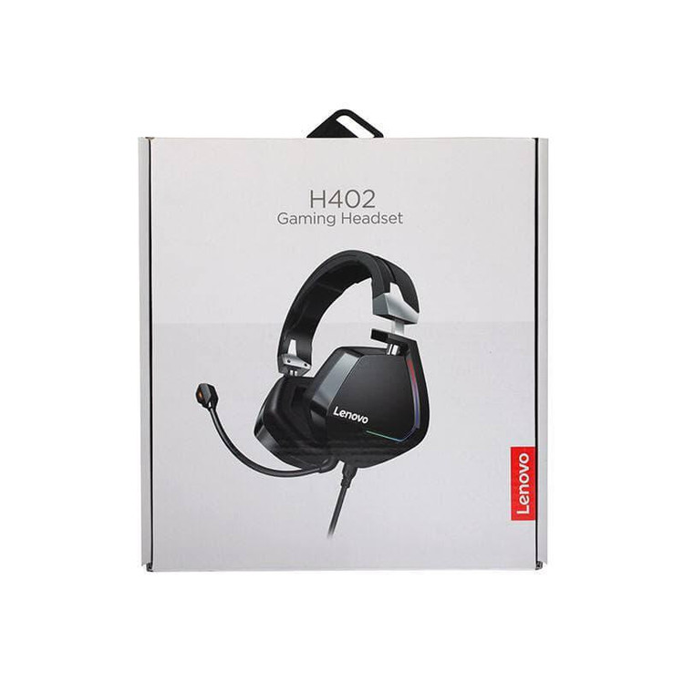 هدست حرفه ای گیمینگ لنوو مدل H402 USB7,1 که همانطور که از نامش مشخص است از کارت صدای 7.1 USB میتواند میزان صدا را به صورت جداگانه تنظیم کند تا صدای فراگیر خیره کنندهای فراهم کند. بلندگوی HiFi با قطر 40 میلیمتر دارای حساسیت بالا و اثر دقیق کاهش صدا است که به شما امکان میدهد جزئیات صدا را دریافت کرده و یک میدان جنگ واقعی بازی را تجربه کنید. طراحی چشمگیر هدست گیمینگ لنوو H402 به همراه ledهای تعبیه شده بر روی گوشیهای هدفون، جذابیت این هدفون را افزایش داده که این نورها بسیار جالب و شگفت آور بر روی هدست در حال حرکت هستند و هدفون شیکتر به نظر میرسد. میکروفون تعبیه شده در هدفون قابلیت جداسازی و نصب آسان دارد و میتوانید آن را به سمت گوشیها بچرخانید تا پنهان شود. جنس قسمتی از هدفون که روی گوش قرار میگیرد، از چرم بوده و از تعریق در بلند مدت جلوگیری میکند. هدست لنوو H402 در دو نسخه متفاوت تولید شده که یک نسخه دارای دو جک 3.5 میلی متری برای هدست و میکروفن و یک USB جهت روشن کردن LED ها طراحی شده و مدل دوم این هدست فقط از طریق یک USB به کامیپیوتر شما متصل میگردد محصولی که در حال حاضر خواندن مشخصات آن میباشد نسخه USB 7.1 بوده و فقط از طریق یک کابل USB به کامپیوتر شما متصل میگردد. از جمله تفاوت های این دو نسخه با یک دیگر همین مساله 7.1 بودن صدای آن می باشد که صدای خروجی این محصول به صورت 7.1 می باشد.